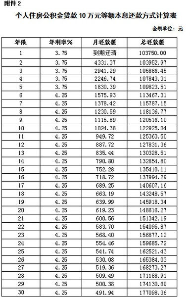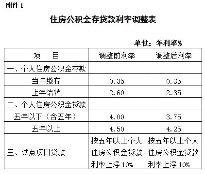 二、从2014年11月22日起,下调个人住房公积金贷款利率。五年期以上个人住房公积金贷款利率由4.50%下调至4.25%;五年期以下(含五年)个人住房公积金贷款利率由4.00%下调至3.75%。